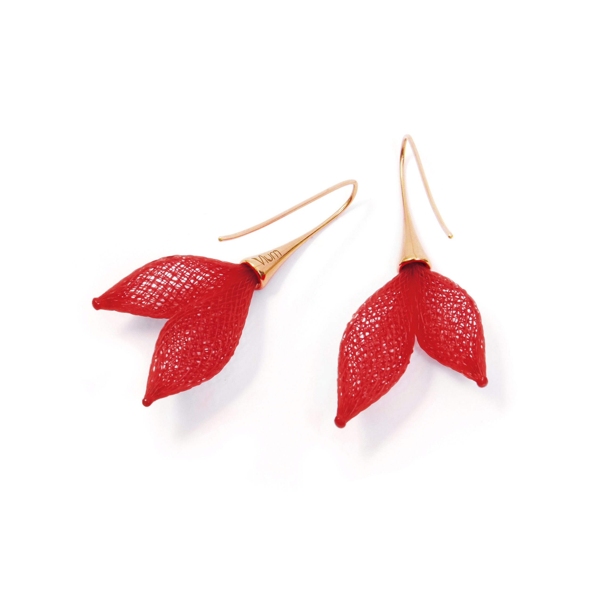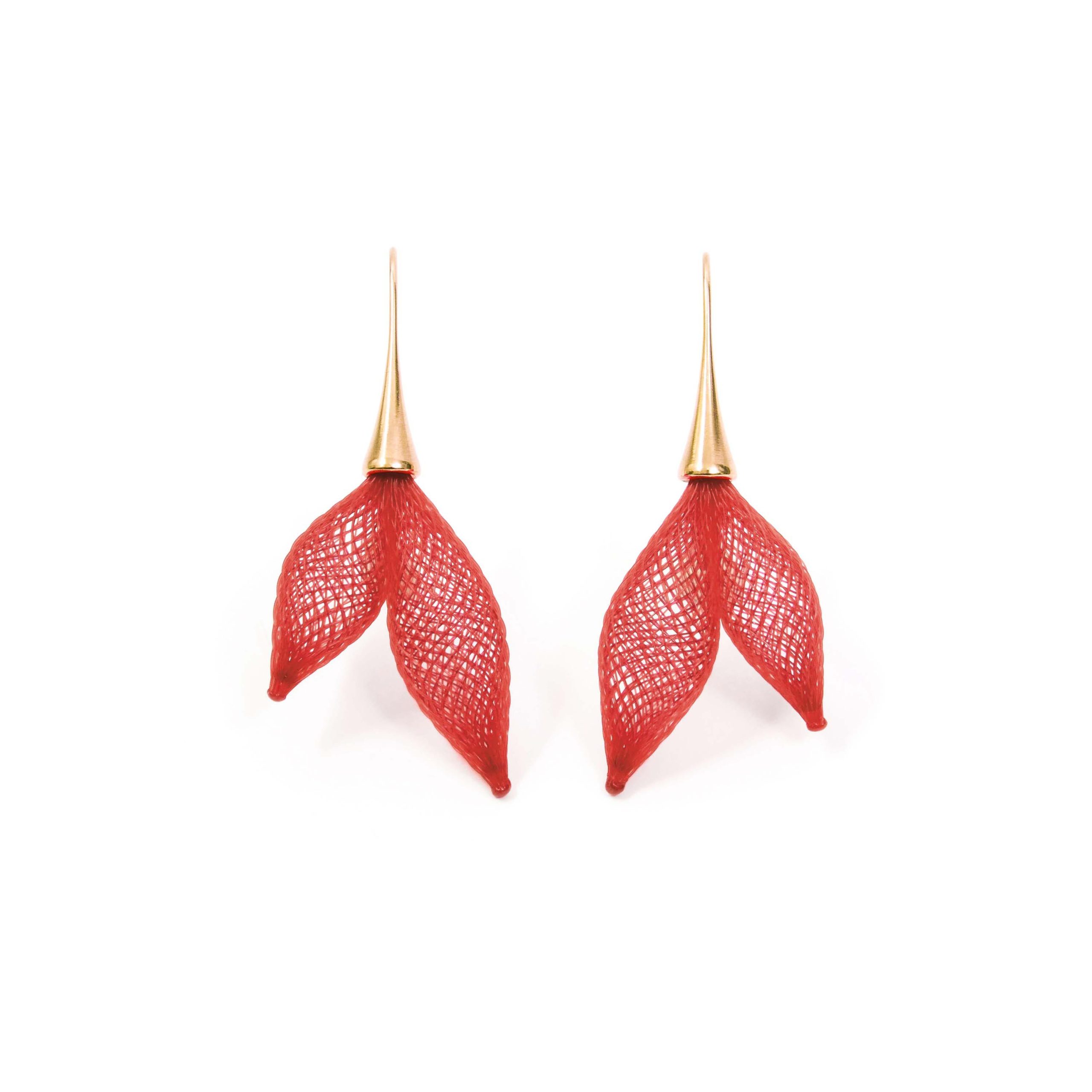 Sortis du néant, les éléments semblent fleurir du métal… Bijou composé de fils de Nylon tressés et montures en laiton doré à l’Or fin 24k.