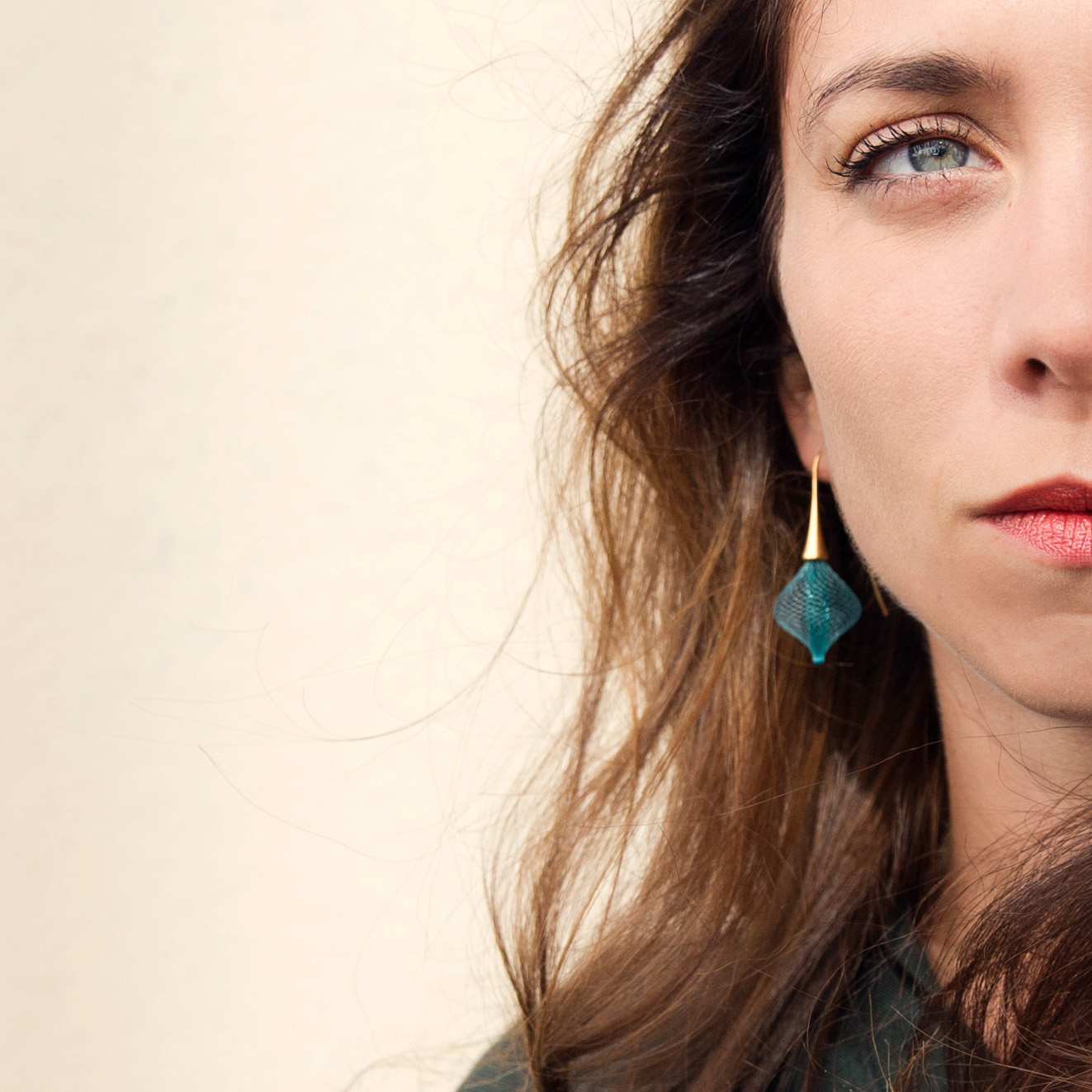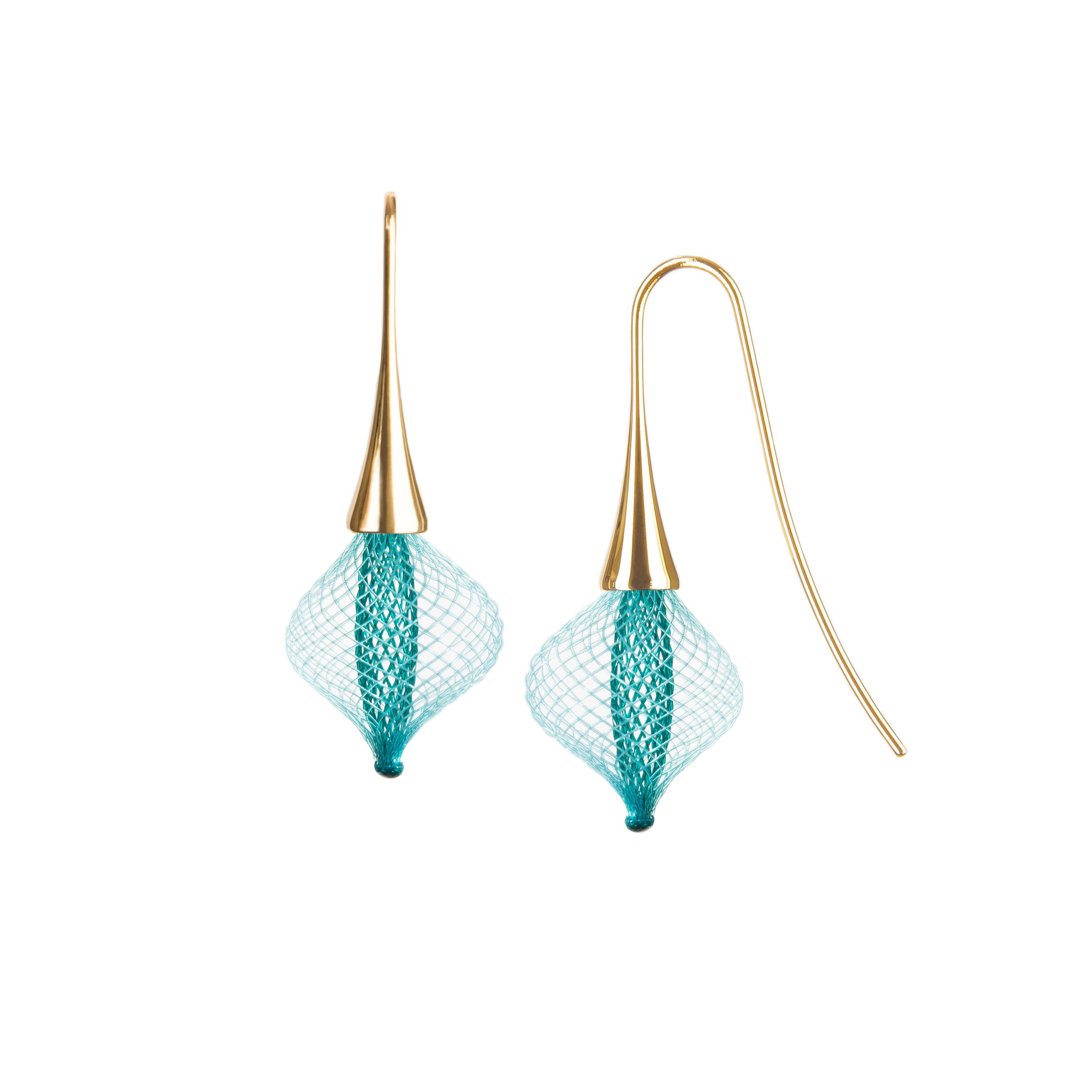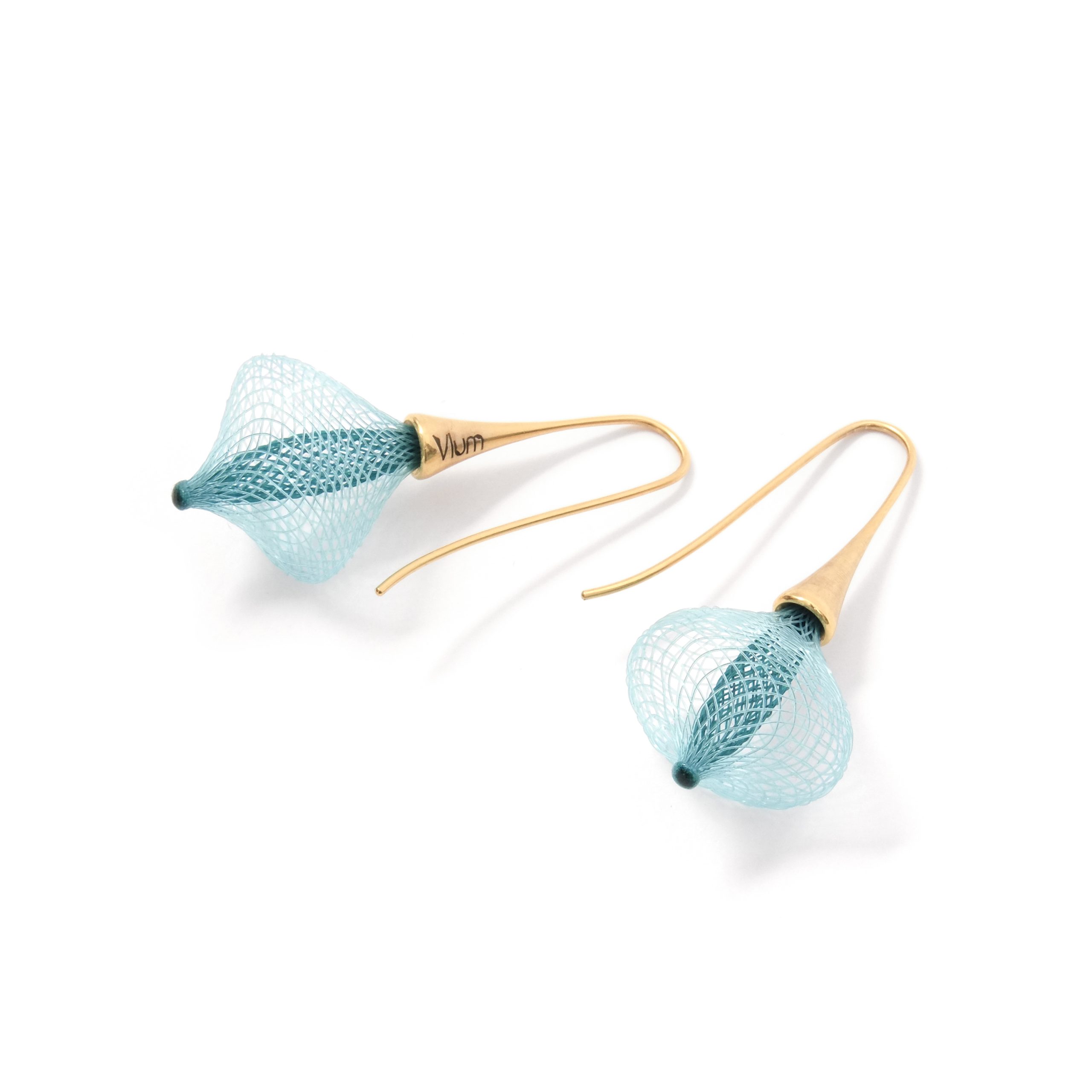 Des formes plus aériennes encore… Bijou composé de fils de Nylon tressés et montures en laiton doré à l’Or fin 24k.