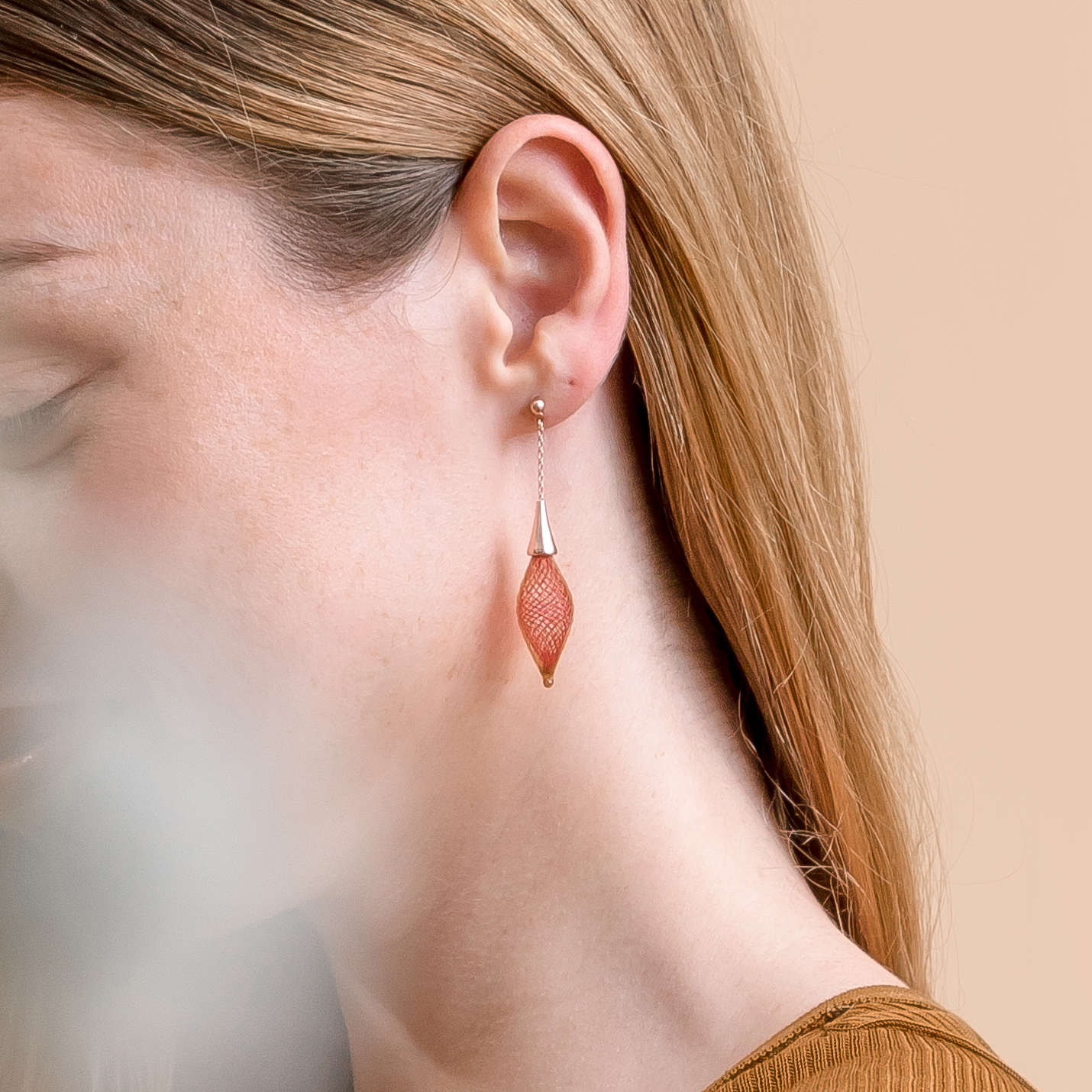 Mouvantes et vibrantes, ces boucles d’oreilles intriguent par leur système de fermeture invisible: les petits éléments sont amovibles. Ce sont deux paires de boucles en une puisqu’elles se portent en version simple ou double… Bijou composé de fils de Nylon tressés et montures en laiton doré à l’Or fin 24k.